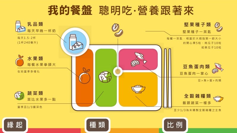 查詢資料後發現,這是衛生福利部根據臺灣最新的《每日飲食指南》,於2018年9月設計推出的出圖像化「我的餐盤」與配合口訣,藉此推廣每日均衡飲食的概念。