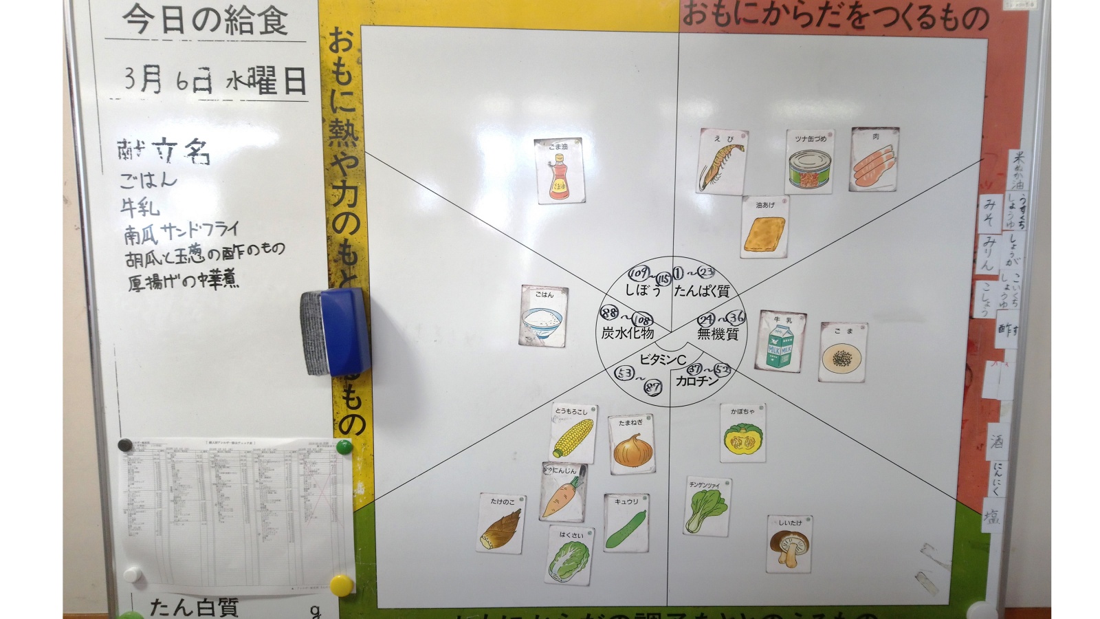為了讓孩子們容易了解,在日本任何一所小學的走廊佈告欄裡,幾乎都會貼有一張「三色食品群分類表」,當天營養午餐使用的食材,營養是否均衡,只要看圖就能夠一目了然。