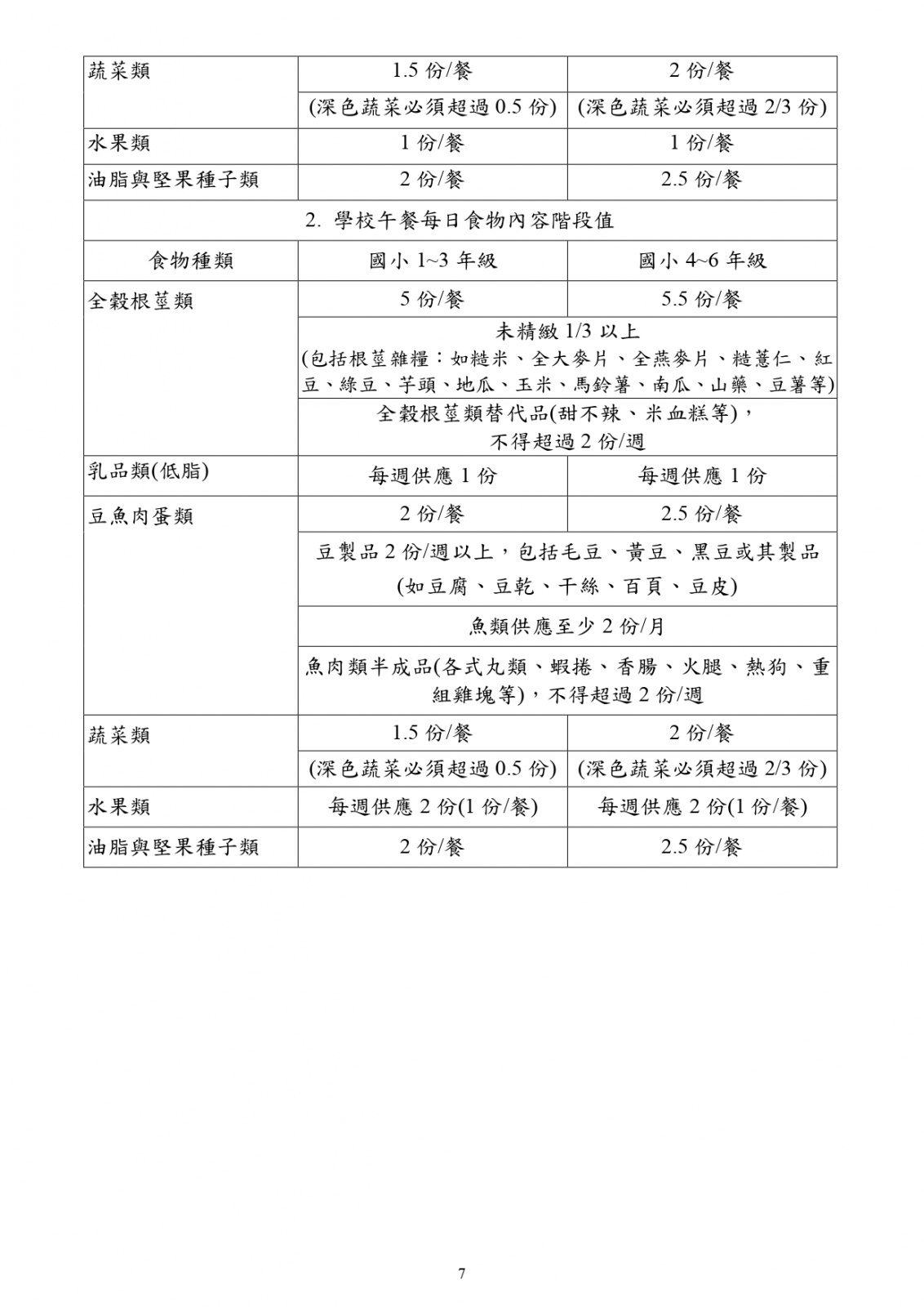 附上臺灣教育部於2013年公布的「學校午餐食物內容及營養基準」,說明每日學校餐點須符合的營養基準及注意事項。