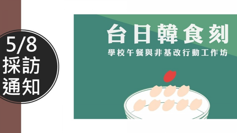 2018年五月全球「反孟山都行動(March Against Monsanto)」前夕,學校午餐22、校園午餐搞非基、台灣無基改推動聯盟等民間組織,特別邀請日本、韓國二地關注學校午餐與反基改運動倡議者連袂來台,分享各自民間推廣教育與行動經驗。現場亦將共同簽署《2018年台日韓反基改運動連線宣言》,宣示未來維持緊密的交流合作,共同打造人人都能吃到安全食物的城鄉共生社會。