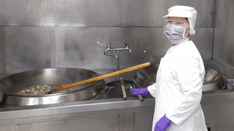她是三民國小附設幼稚園的正職廚師,每天早上七點上班準備兩次的點心,下午四點環境整理結束下班。