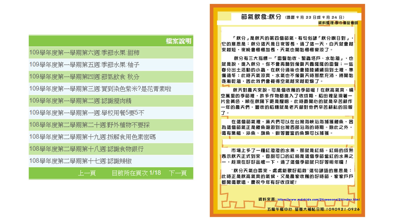 營養大補帖會針對每週的時事,例如採訪時正值秋分,營養師會用簡短的文字和故事告訴大家應該要吃哪一些當季的食物。由於現在網路發達,訊息真假孩子難以掌握,因此與其讓孩子自己看錯誤的報導,不如營養師自己整理重點,讓青春期的國中生輕鬆並快速的認識自己的飲食。