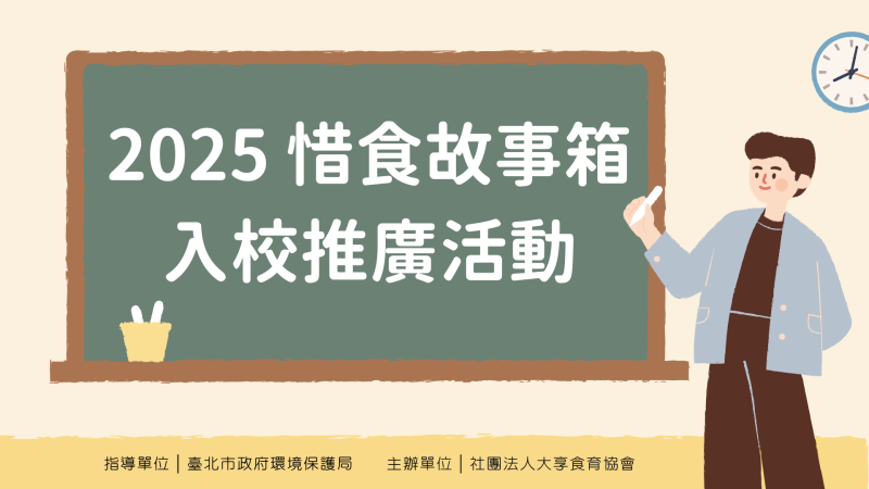 2025 年大享食育協會將《打擊廚餘鬼,惜食戰士非我莫屬》廣播劇裡的故事情節及角色人物──廚餘鬼、精靈及挑挑視覺化,打造一款可攜式「惜食故事箱」,期望進入臺北市轄內教育機構推廣。邀請有意願合作的教育機構,聽我們分享惜食故事,種下孩子們心中那顆不浪費的種子。