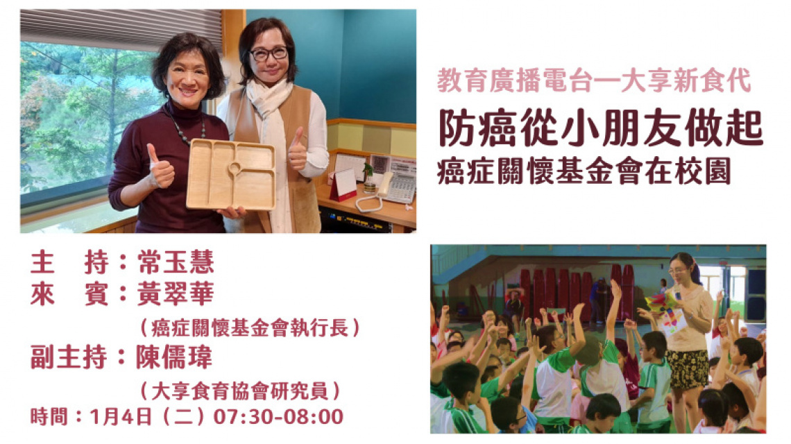 大享食育協會自2019年開始,與教育廣播電台節目「教育行動家」合作每月一次的單元「大享新食代」,由台北市家長協會常玉慧理事主持,本會黃嘉琳秘書長、陳儒瑋研究員擔任副主持人,週二上午於空中與大家相會。