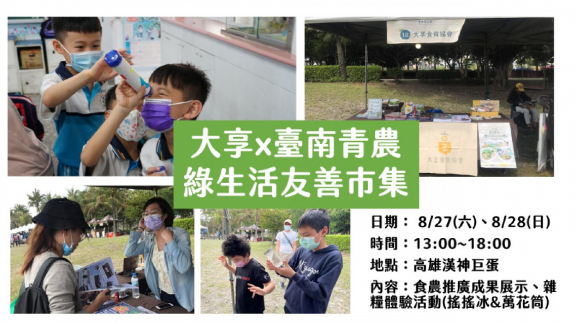 大享本次受邀參加臺南青農在漢神巨蛋的市集,在市集中進行親子雜糧食農體驗活動和展示大享食農推廣成果,歡迎高雄的朋友報名雜糧課,來現場找我們玩!