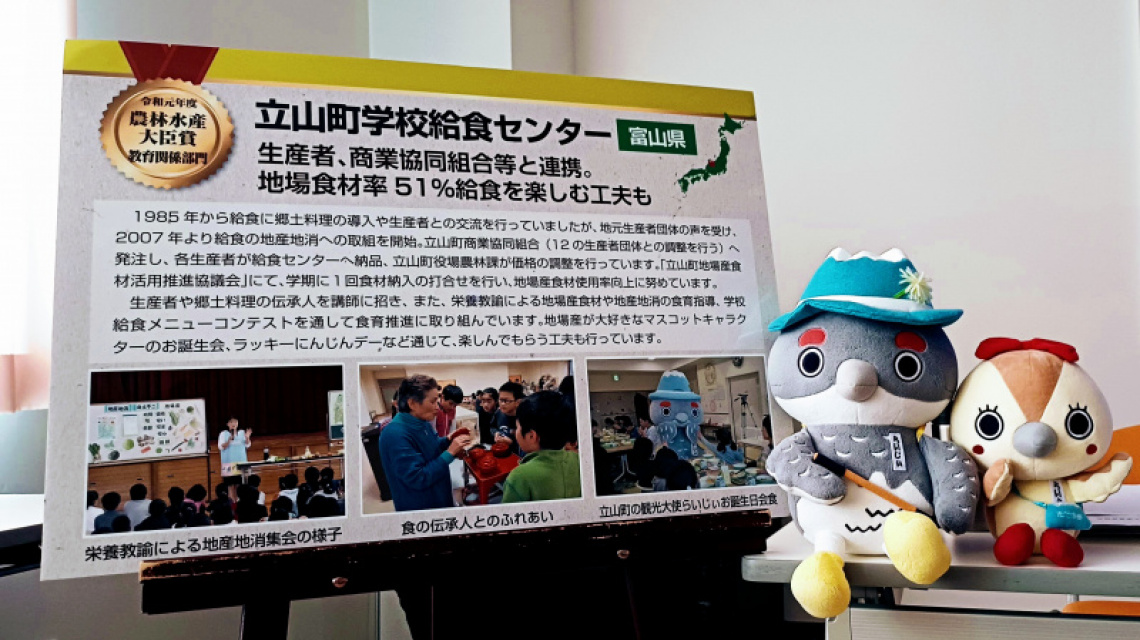 富山縣立山町學校給食中心負責供應6所小學、1所國中與中心職員等1920份餐點,參訪當日餐點為白飯、五目蔬菜湯、秘製醬汁炸豬排、馬鈴薯玉米沙拉、國產櫻桃及牛奶。