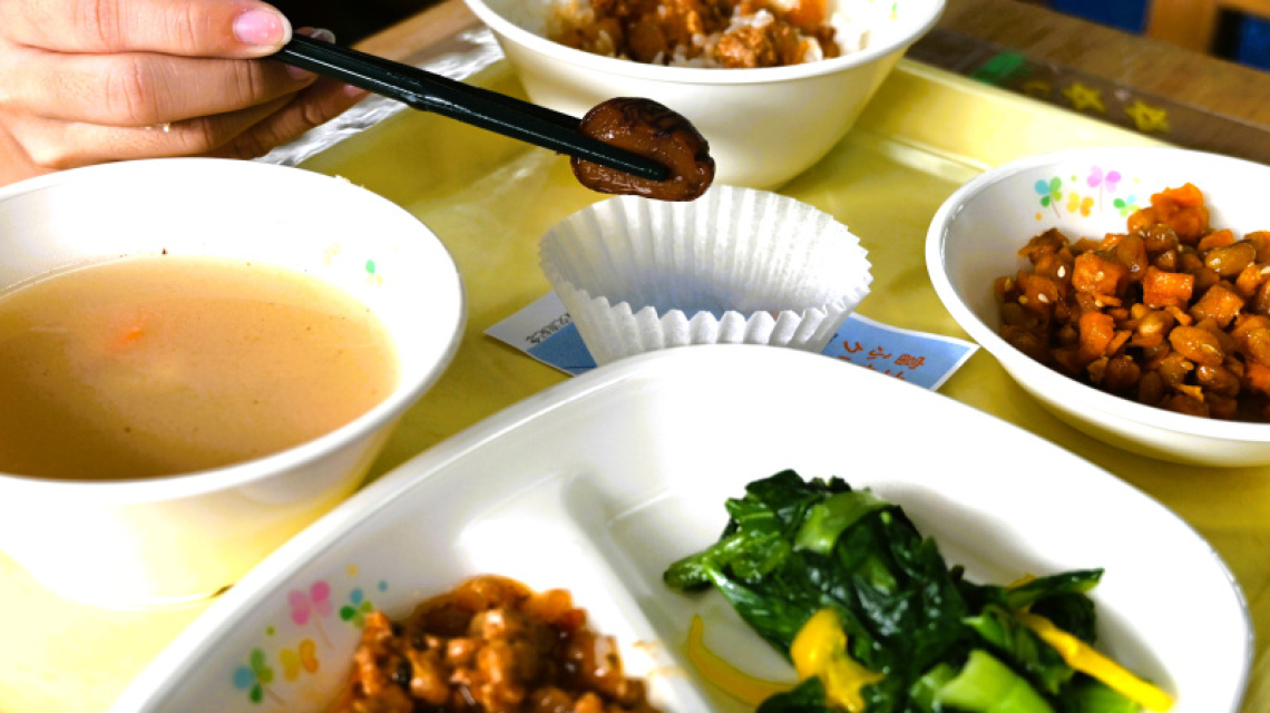 2025年11月6日,台日學校午餐交換菜單包括白飯、台式打拋肉、綠色蔬菜、地瓜黃豆甜辣炸、豆乳味噌湯及栗子澀皮煮,許多孩子首次品嚐這種香甜風味的栗子甜點。