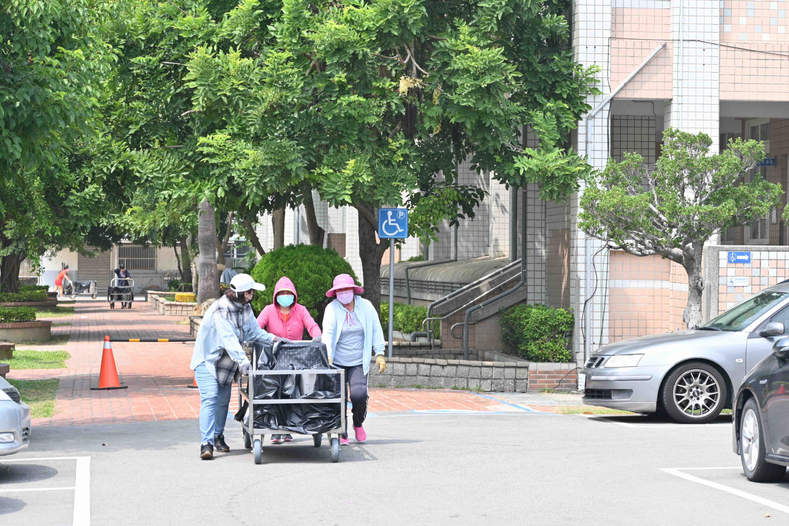 由於校舍廣大,每天都有送餐志工協助搬送低年級學生的餐點。