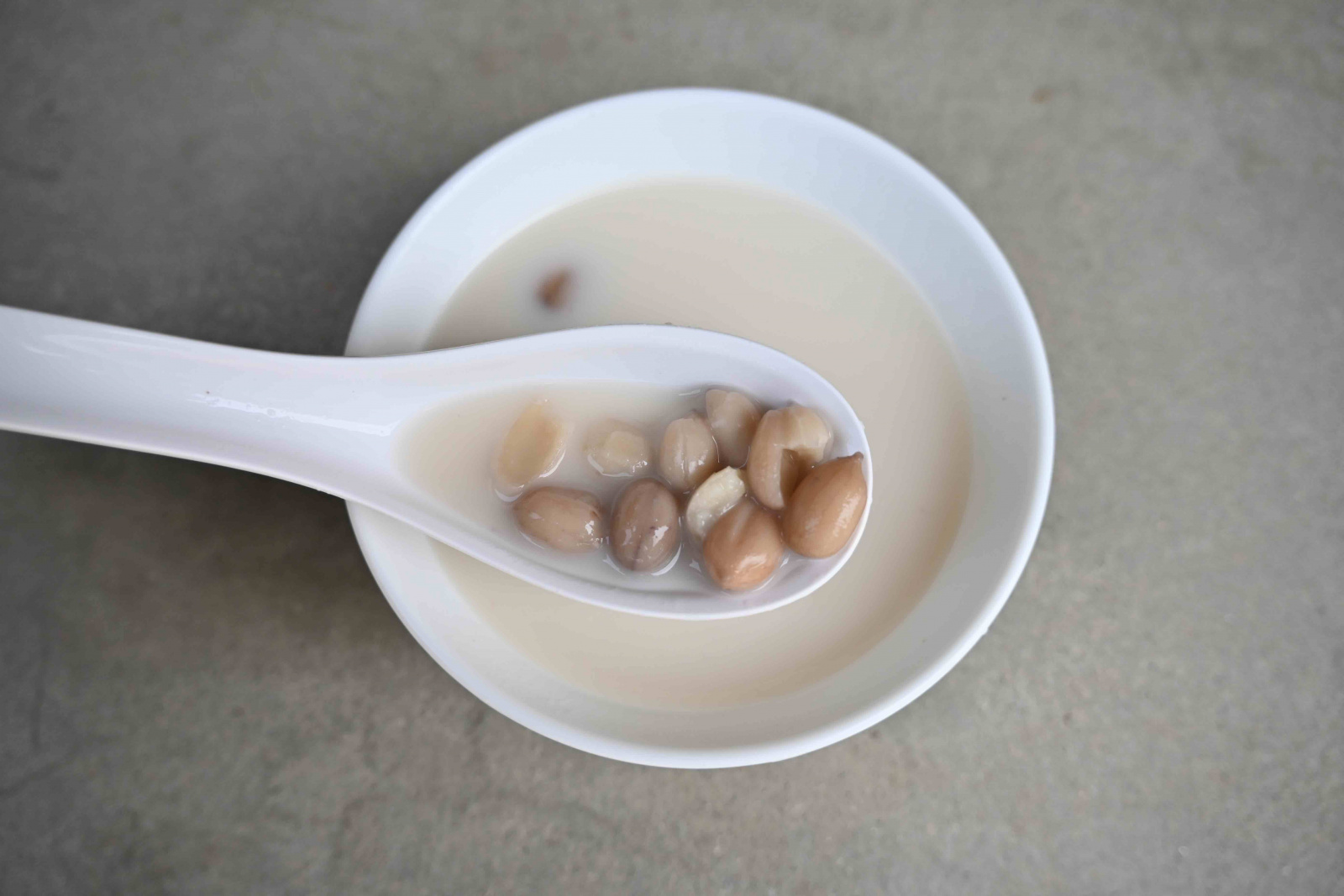 第二道關卡:前處理。對於這道菜的發想,倖槿表示:「我們一開始對這道菜的想像是又綿又鬆」,罐頭牛奶花生湯的口感深植人心,但要如何在學校午餐重現呢?供餐前一天事先泡水三個小時讓果仁充分吸水軟化,瀝乾後再進到冰箱冷凍,以低溫破壞花生的結構。