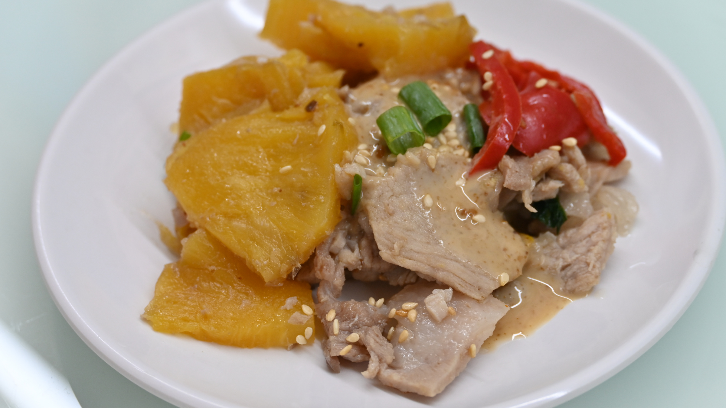 「鳳梨胡麻肉片」的烹調方法是將主要食材以拌醬料方式完成,可減少彩椒、洋蔥的生菜味道,胡麻醬是用美乃滋作為基底製成,雖美乃滋的成分為油質類,我們將適量的鳳梨汁加入胡麻拌醬,除增加鳳梨風味也可減少學生油質的攝取量,最後別忘了供餐前在成品上撒上六大類食物中的堅核果-白芝麻,讓「鳳梨胡麻肉片」更營養滿滿。
